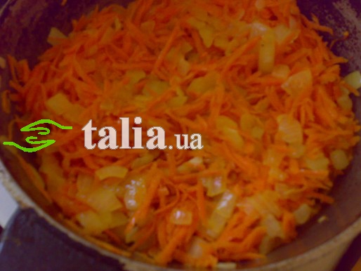 На смеси растительго и сливочного масла обжариваем до прозрачности лук, кладем морковку и жарим помешивая около 5 минут.