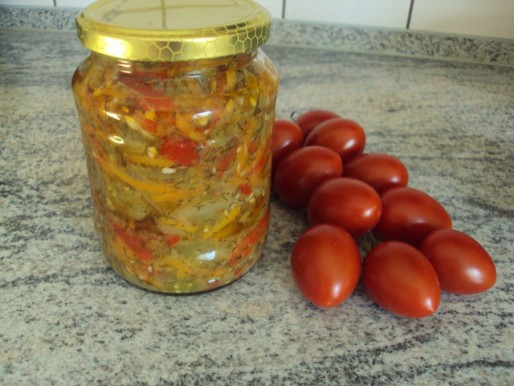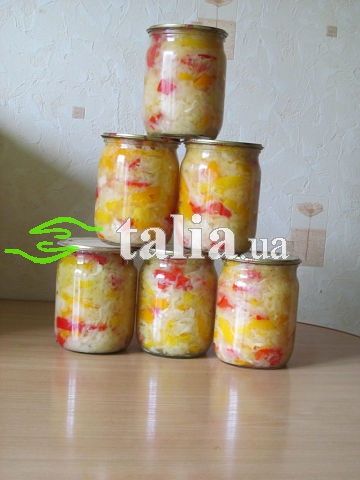 В воду добавляем соль, сахар и растительное масло. Доводим до кипения и закладываем капусту и сладкий перец. Кипятим 5 минут, добавляем 100 гр. уксуса, хорошенько перемешиваем и раскладываем в предварительно простерилизованные банки.
