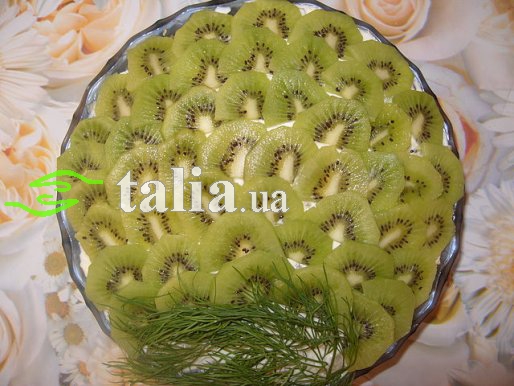 Все слоя салата, кроме последнего, перемажьте майонезом. В этот салат не нужно много майонеза, потому что, ананас и киви достаточно сочные.
