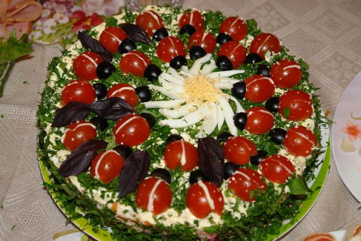 Салат выкладывается слоями. Каждый слой смазывается майонезом.