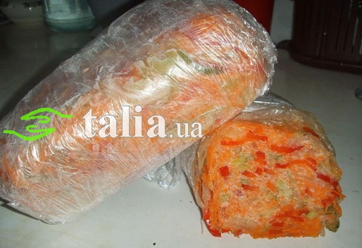 Все овощи моем, чистим. Морковь трём на крупной тёрке. Лук режем мелкими кубиками. Перец сладкий очищаем от семян и нарезаем кубиками или соломкой. Всё перемешиваем, выкладываем на край пищевой плёнки и заворачиваем как колбаску. Замораживам. А когда варим супчик или любые другие блюда с овощами, отрезаем ножиком нужное количество, а остальное опять в морозилку.