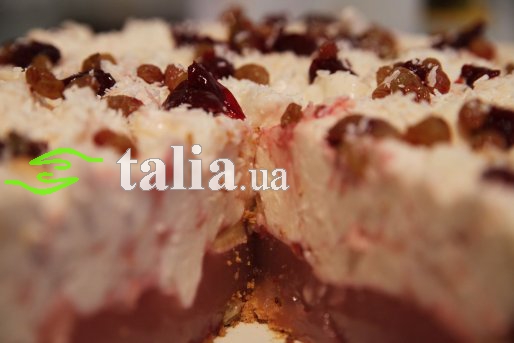 В тортницу на дно выкладываем арахис, вишни, изюм, кусочки банана. Потом столовой ложкой поверх накладываем нашу зефирную массу. И этой же ложкой хорошо перемешиваем массу с орехами и фруктами. Сверху, заливаем желатиновую массу и опять перемешиваем ложкой все, что есть в тортнице. Ставим на 3-4 часа в холод.
