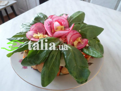 - Например чтобы сделать украшение из редиса нужно его нарезать очень тонкими кружочками и выложить в форме цветочка. Чтобы придать цвет, опускае кружочки на несколько секунд в свекольный сок. Лепестки можно сделать из шпината.