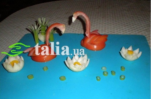 - Из помидорчиков можно сделать лебедей. Из лука и яиц вырезать лилии. Глазки делаем из кусочков маслин или из гвоздики.